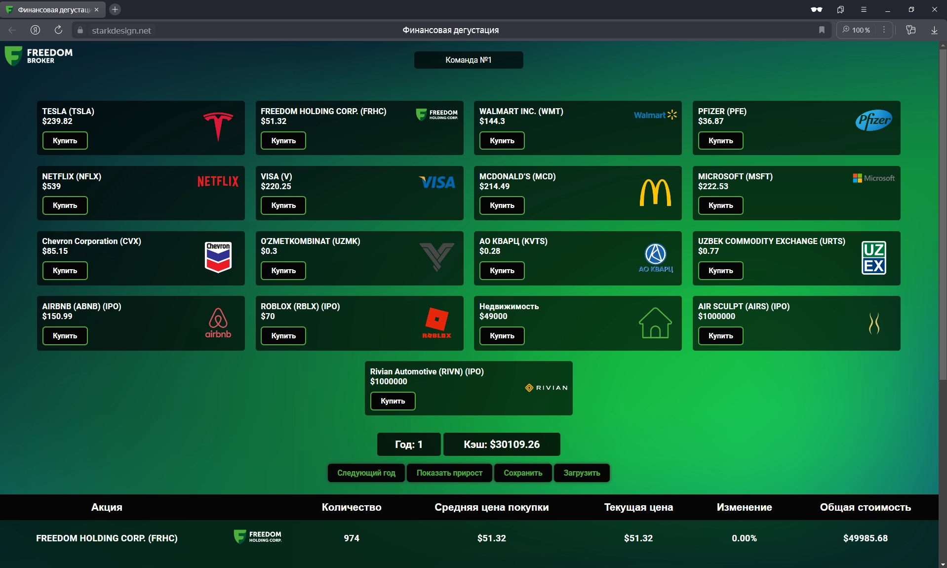 Players can invest in stocks, real estate, initial public offerings (IPOs), or place funds in deposit accounts. In one game session, lasting one hour, participants go through three years in the investment market. At the end of each virtual year, the results of annual returns and price changes of all assets are displayed. Between years, players are provided with current world news, as well as information on various asset classes and specific securities. Additionally, the game has features to save and load progress.